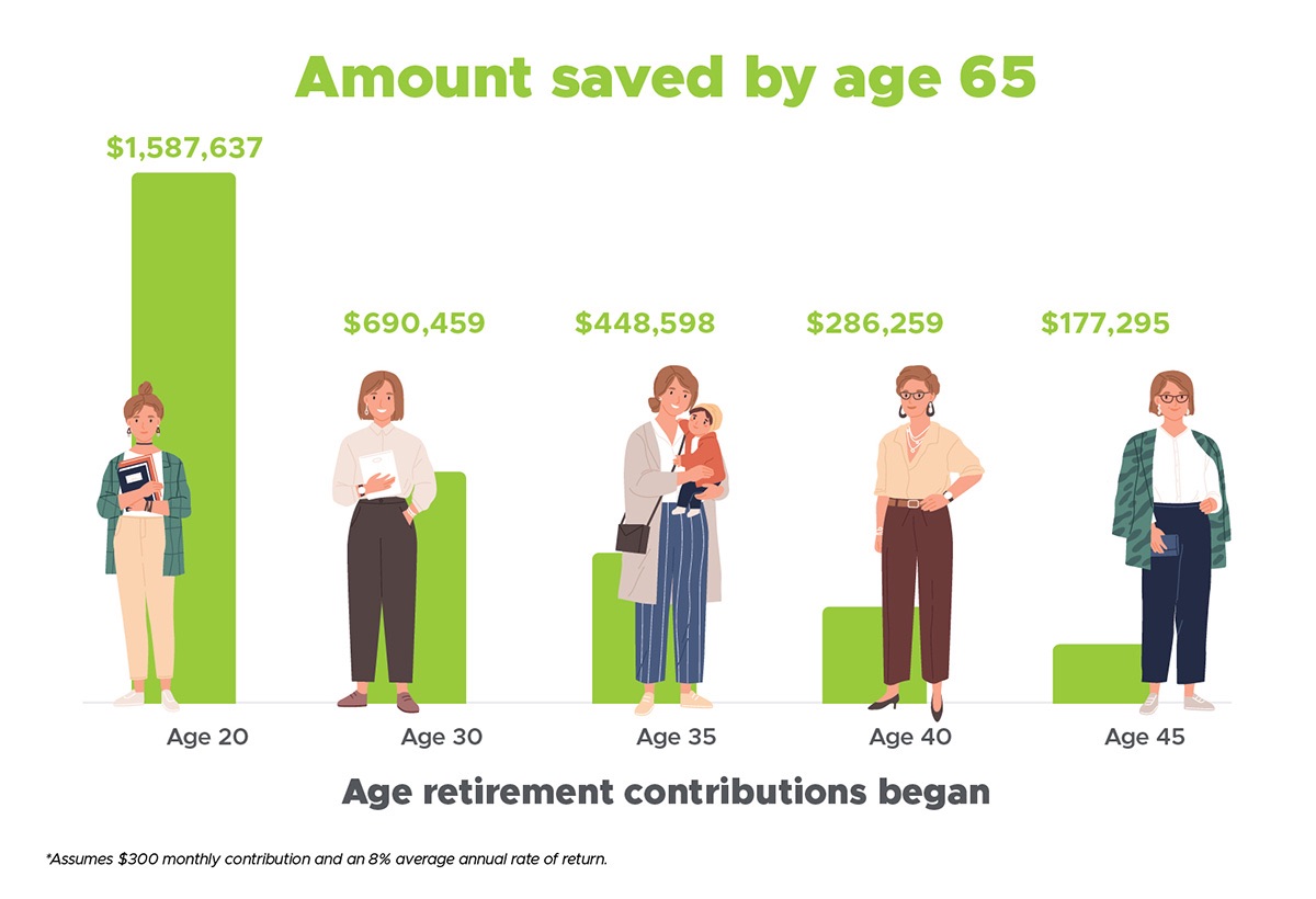 Building a comfortable retirement isn’t only about the amount you contribute. Starting sooner and being consistent are major factors, too. Small, steady growth over time can lead to big growth (and a more comfortable retirement) long-term.